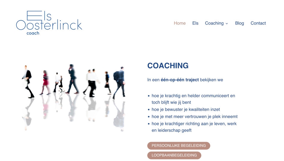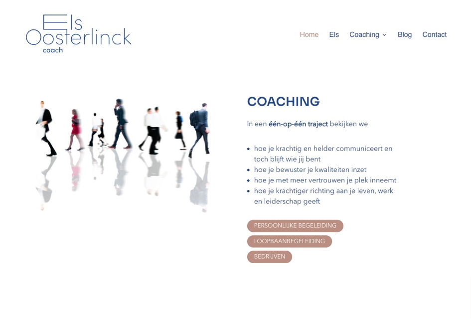 Els begeleidt individuen in hun ontwikkeling, met aandacht, scherpte en een breed palet aan methodieken. Site in WordPress met Divi.